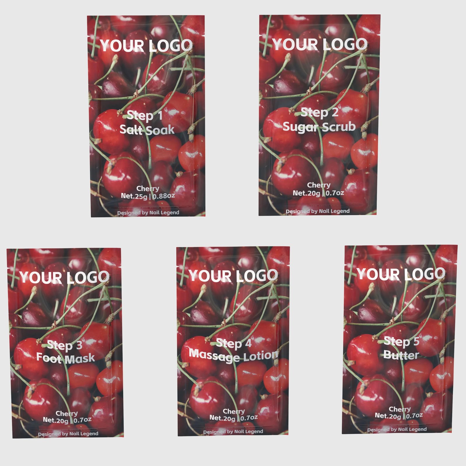 Deluxe Pedicure Kit 5 in 1, Salt Soak, Sugar Scrub, Mud Mask, Massage Motion, Butter, — Private label OEM 5-in-1 deluxe pedicure kit from Nail Legend. MOQ 5000 sets, custom formula / pack / branding supported. Request a quote for SKU-level pricing.