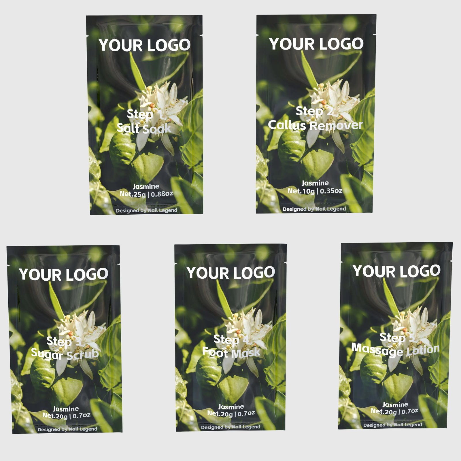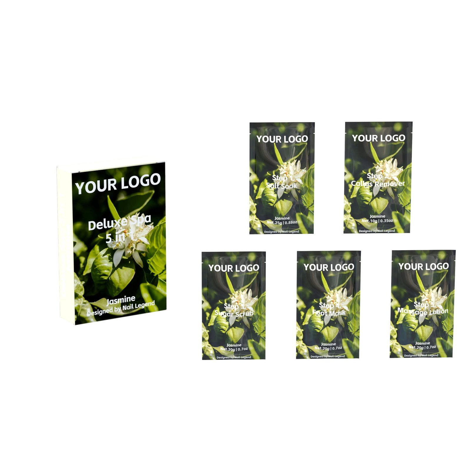 Deluxe Spa 5 in 1, Salt Soak, Callus Remover, Sugar Scrub, Foot Mask, Massage Motion, — OEM & Private Label Wholesale