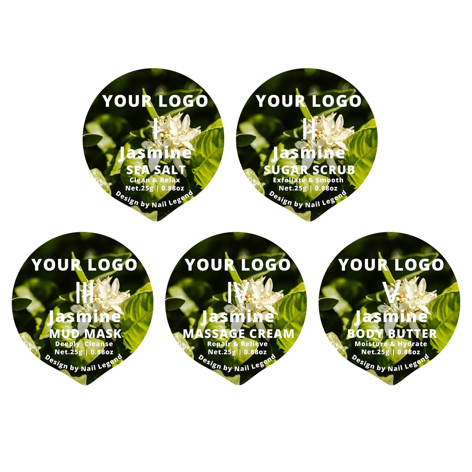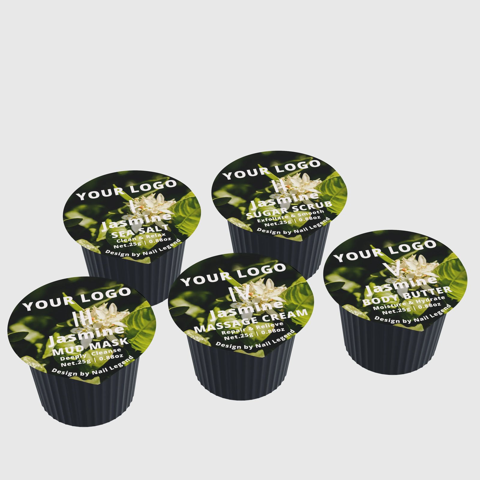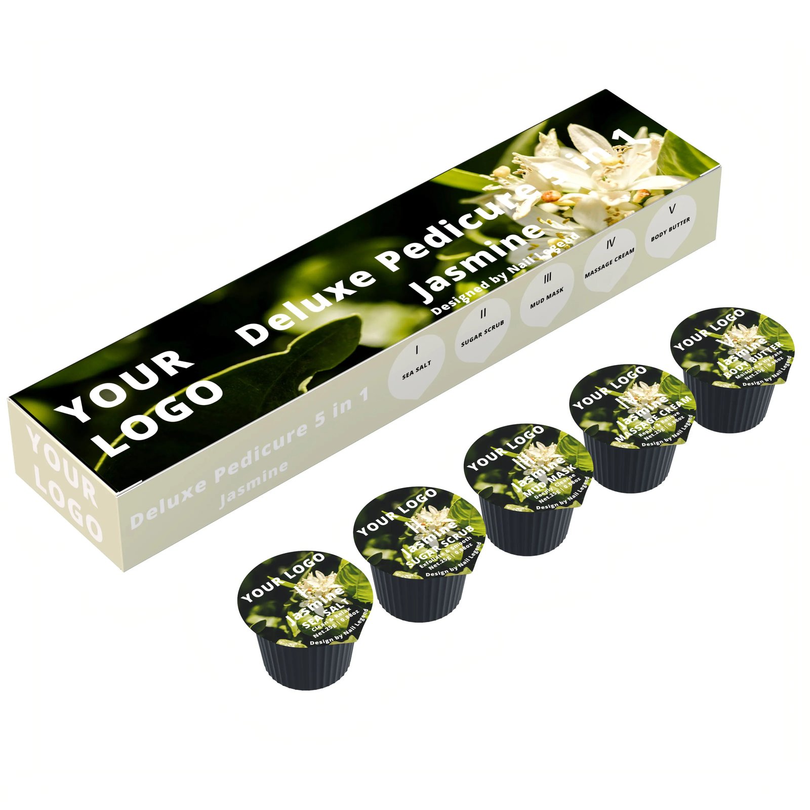 5-in-1 Deluxe Vegan Pedicure Kit Salt Soak Sugar Scrub Mud Mask Massage Cream Butter — Private label OEM 5-in-1 golden deluxe spa kit from Nail Legend. MOQ 5000 sets, custom formula / pack / branding supported. Request a quote for SKU-level pricing.