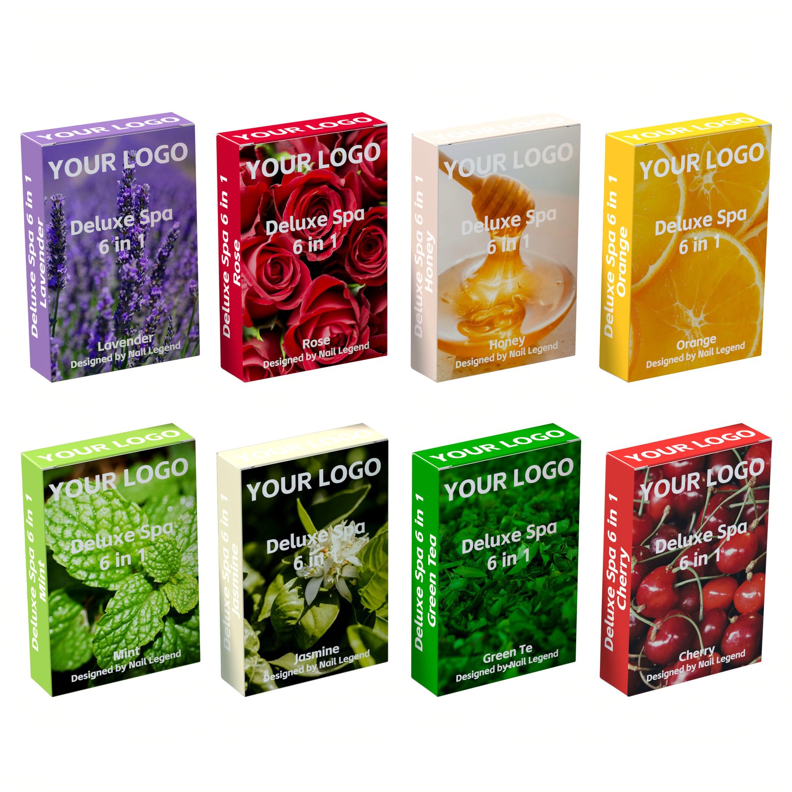 Eight stock scents — Lavender, Rose, Honey, Orange, Mint, Jasmine, Green Tea, Cherry — plus custom development.