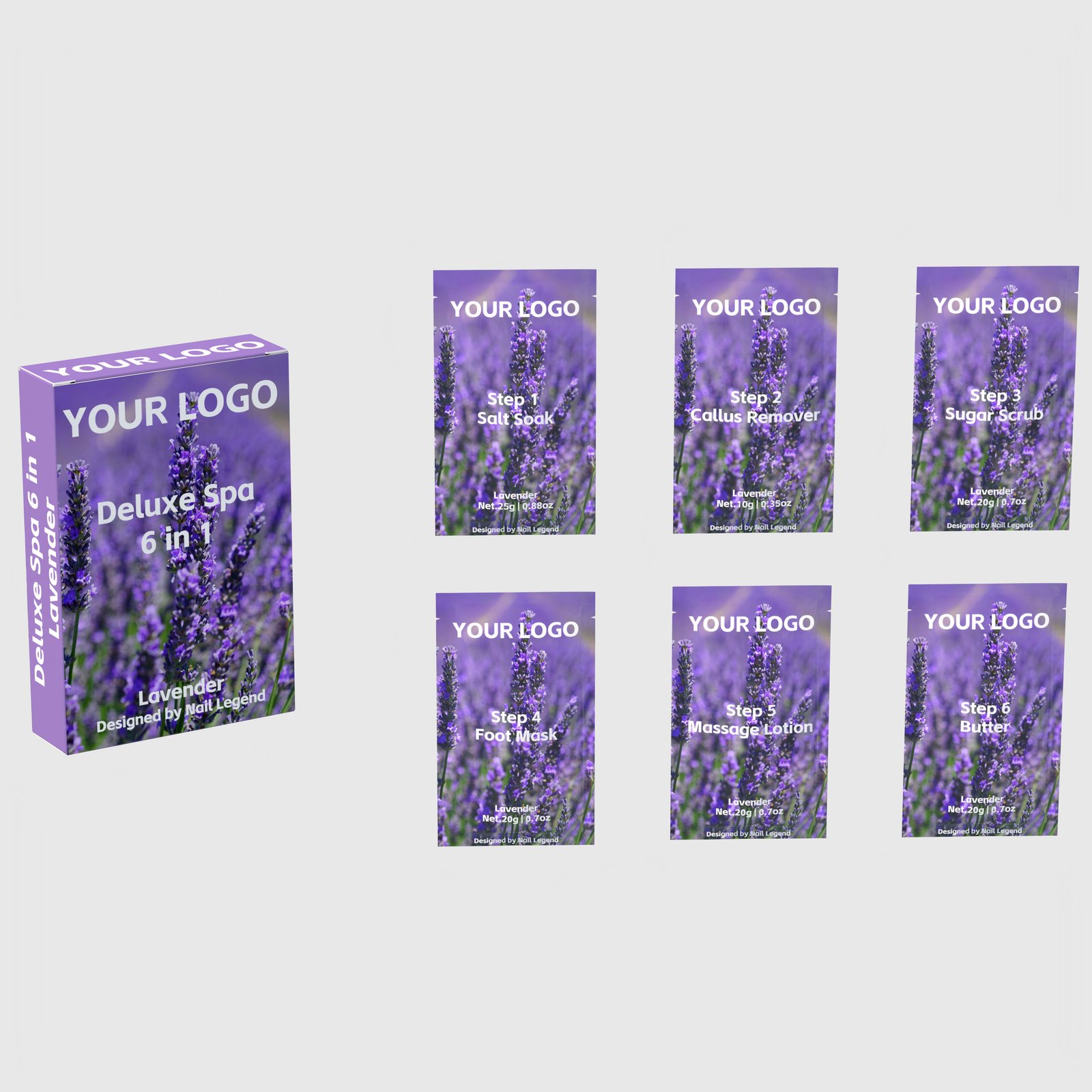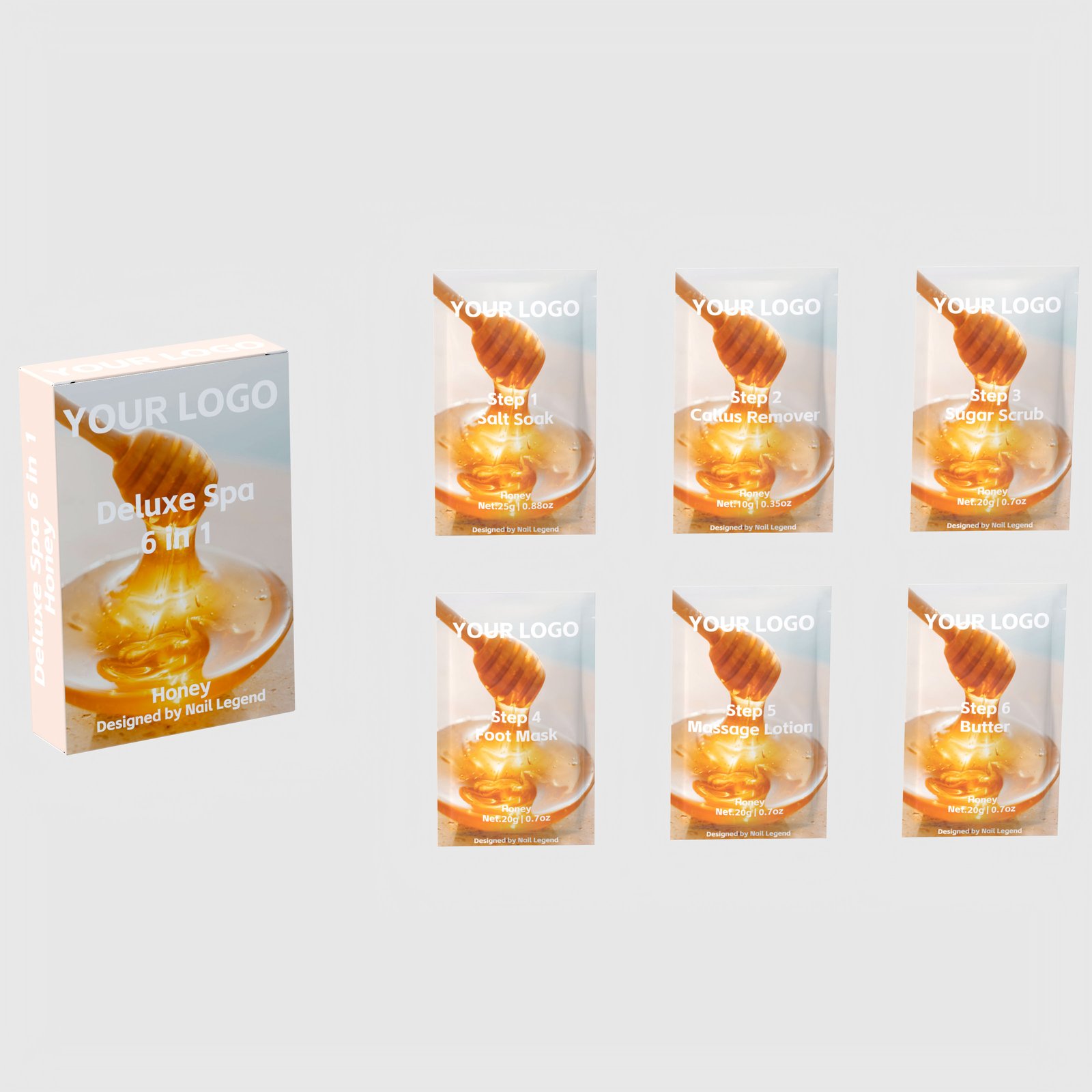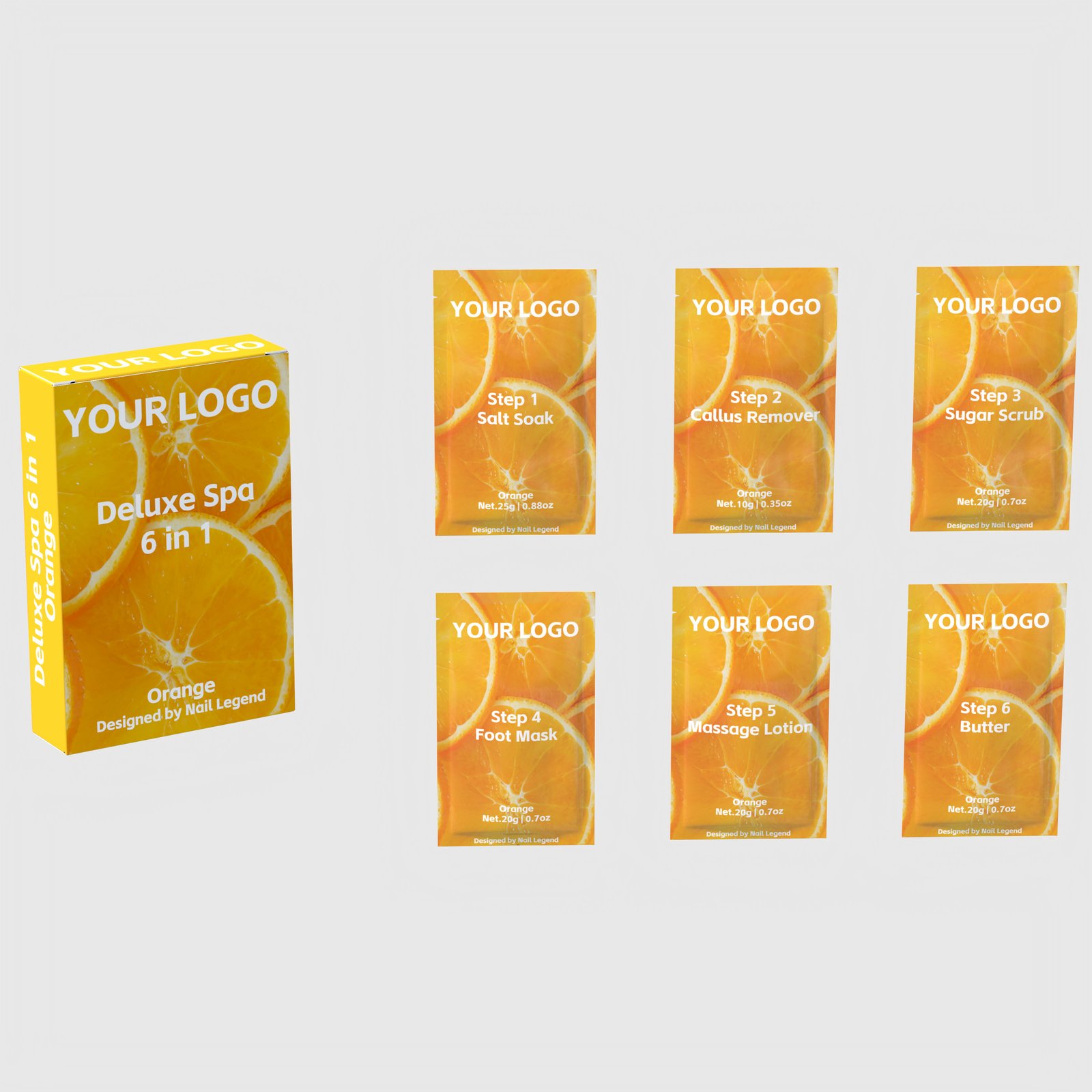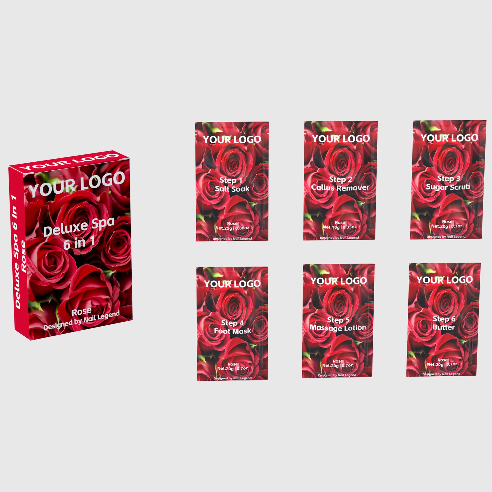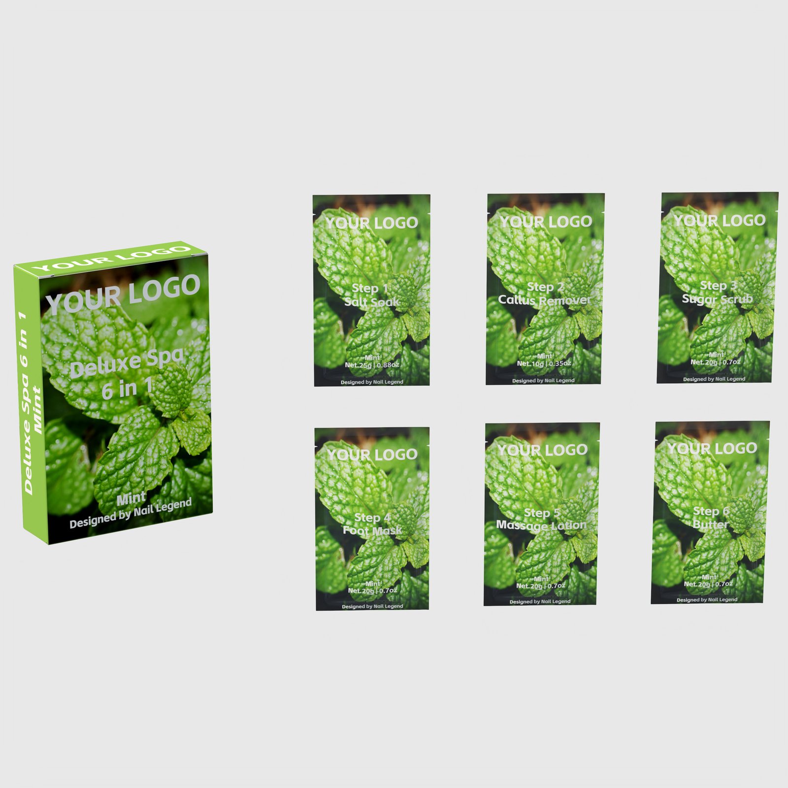 | Packaging | Six sachets per set (25g Salt + 10g Callus + 4 × 20g) inside a printed pouch or retail folding carton — 12.5 × 8.5 × 3 cm outer, 0.135 kg gross per set |