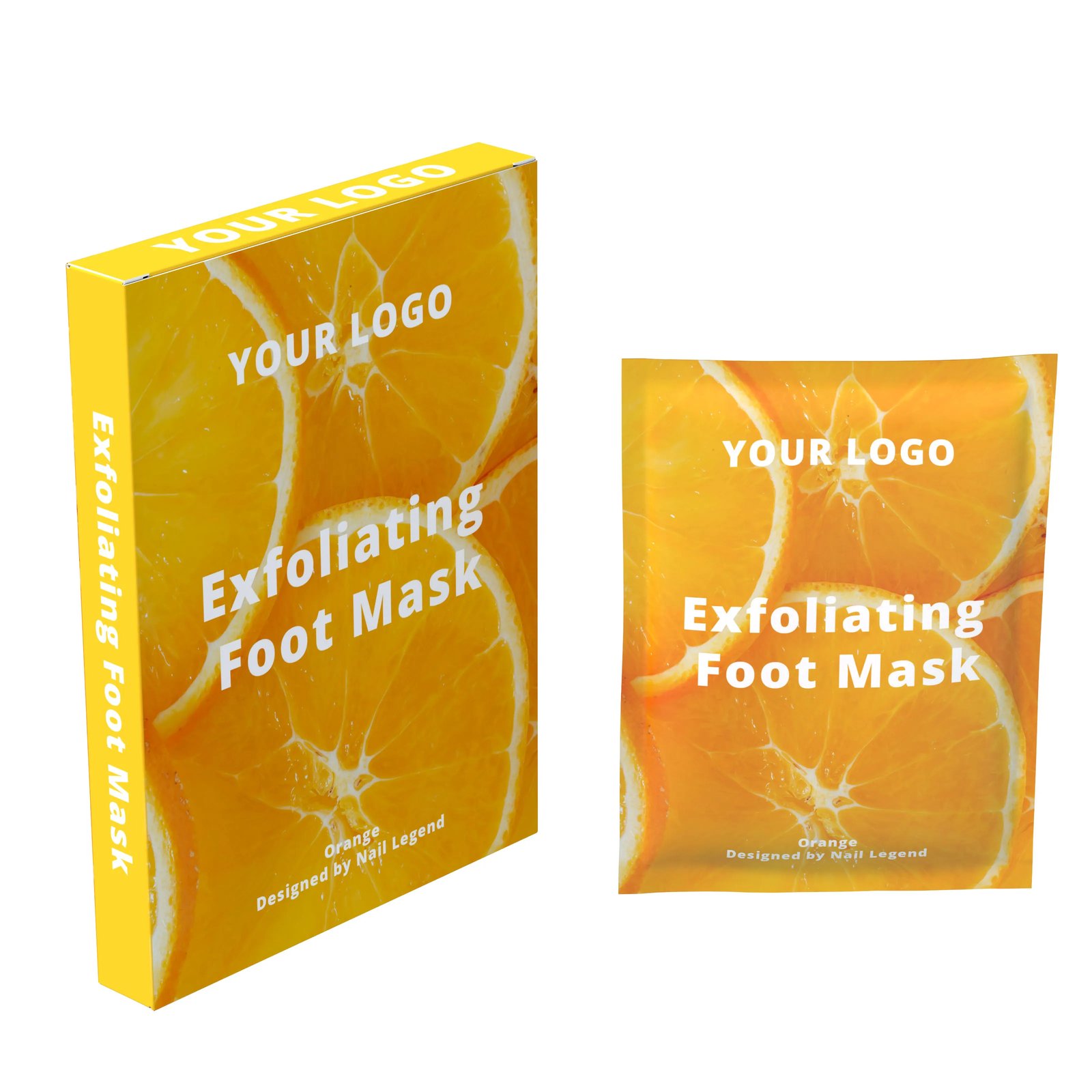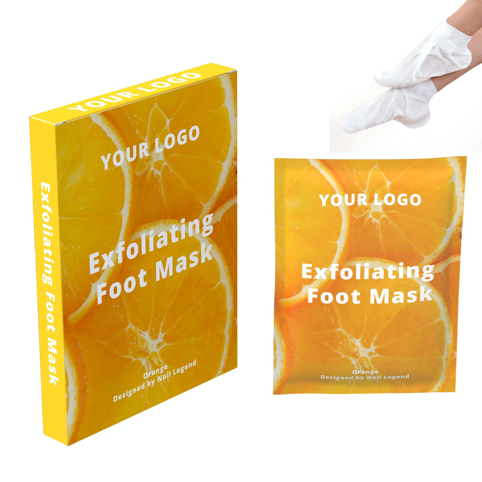 Orange Foot Mask Private Label Pedicure Treatment Moisturizing Exfoliating Dead Skin — Private label OEM hand & foot mask from Nail Legend. MOQ 3000 boxes, custom formula / pack / branding supported. Request a quote for SKU-level pricing.